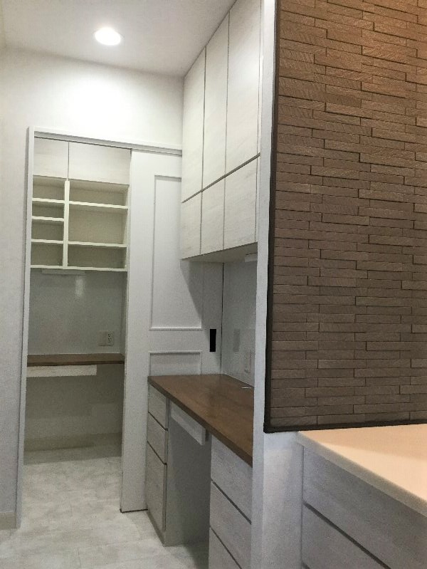 対面カウンターをなくして、ダイニング+キッチン+書斎の3つのスペースに一体感が生まれました。 部屋の中央にセンターカウンターを設けることで、モバイル機器の充電、買ってきた物の一時置きや配膳が便利になりました。 キッチンは人工大理石を使用し、扉とキッチンパネルはホーロー製で汚れや傷に強く、マグネットの小物なども取り付けることができ、とても便利です。 書斎もスペースを少し大きくすることで広々と使用できるようになりました。 また床材は明るい天然石調のフローリングを選び、床暖房も採用して寒い冬にも考慮しました。