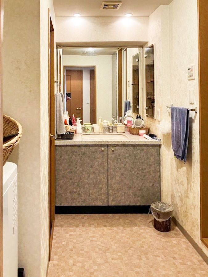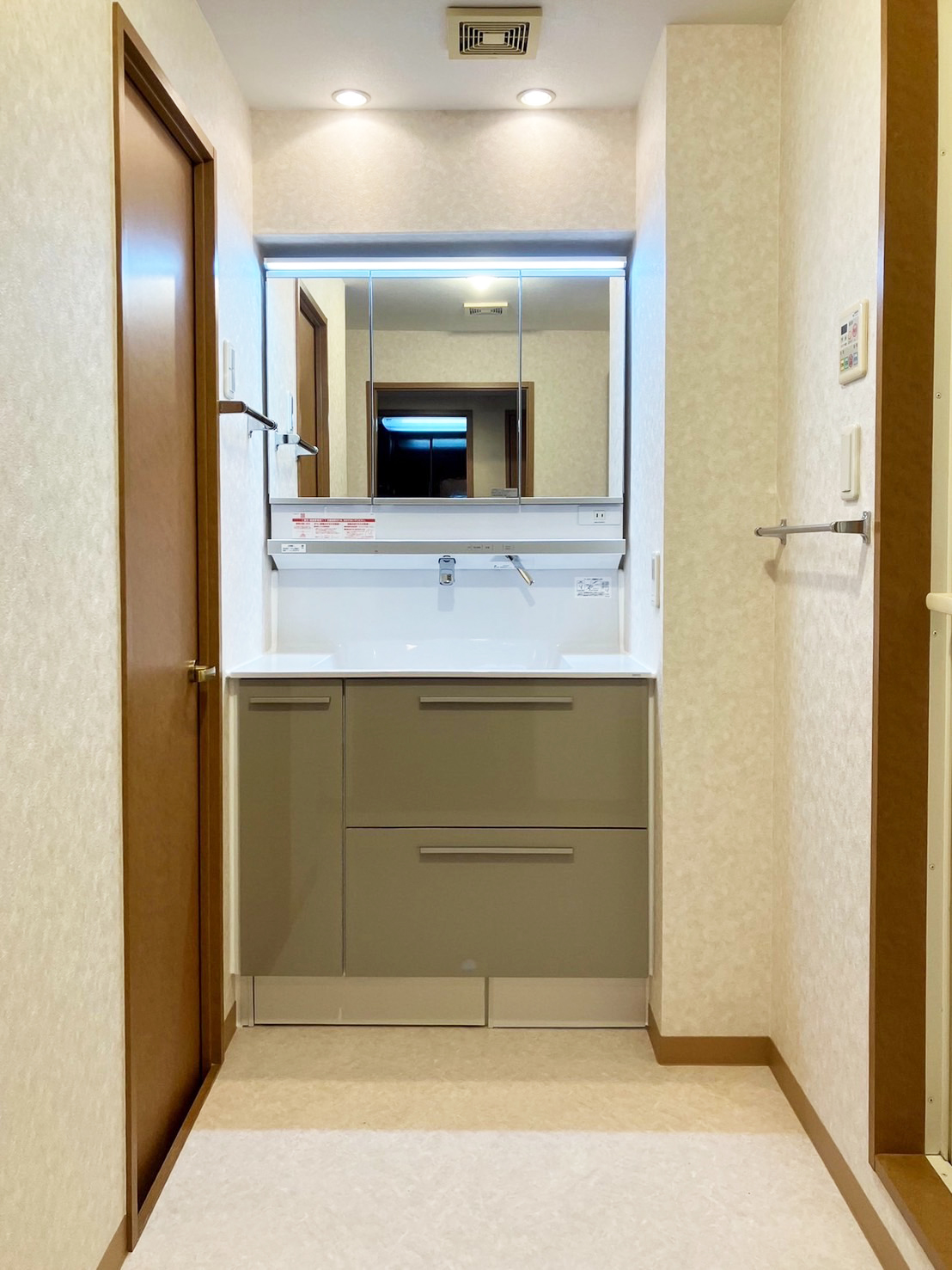 洗面化粧台をリフォームしました。 床・壁・天井の内装も一新しました。 ●洗面台 水栓が上部にあるため水垢汚れが付きにくく、 広いボウルで洗いやすいお掃除ラクラク設計の洗面化粧台です。 洗面化粧台 TOTO オクターブ 間口900mm 三面鏡 扉色:オーブグレージュ